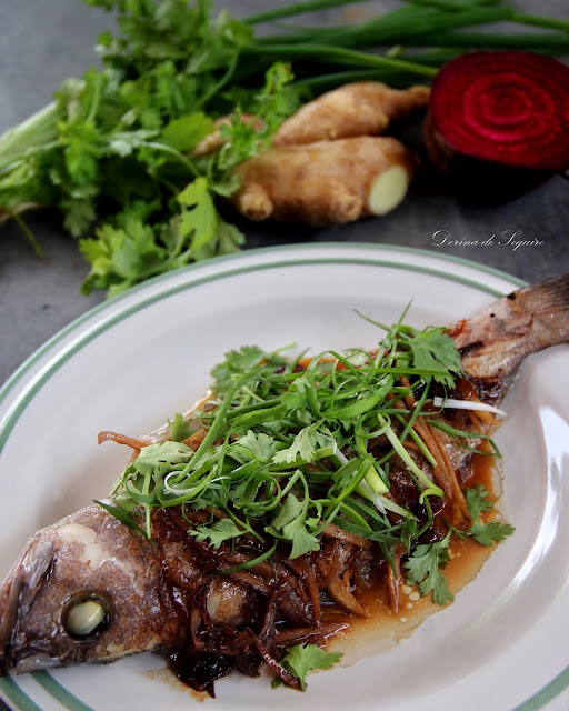 Padamkan api dan tuangkan sos ke atas ikan. Hiaskan dengan daun bawang serta daun ketumbar. Sedia di hidang.